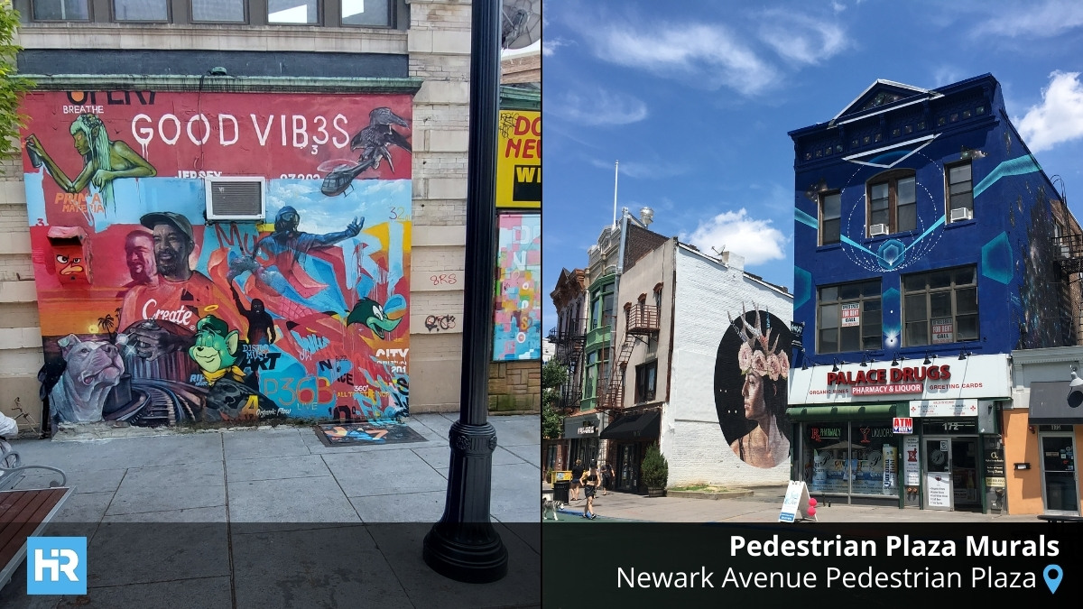 Downtown feels louder, visually and culturally. Near Newark Avenue’s pedestrian plaza, layers of graffiti, paste-ups, and sanctioned murals overlap, creating walls that read like conversations in progress.