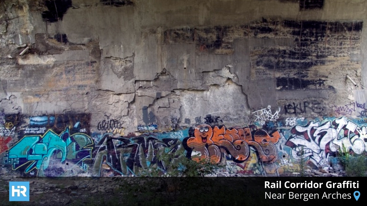 Not all street art is polished or sanctioned. Near the Bergen Arches and along rail corridors, graffiti thrives in its rawest form. These spaces feel temporary and contested — walls layered with names, symbols, and images that might disappear within days.