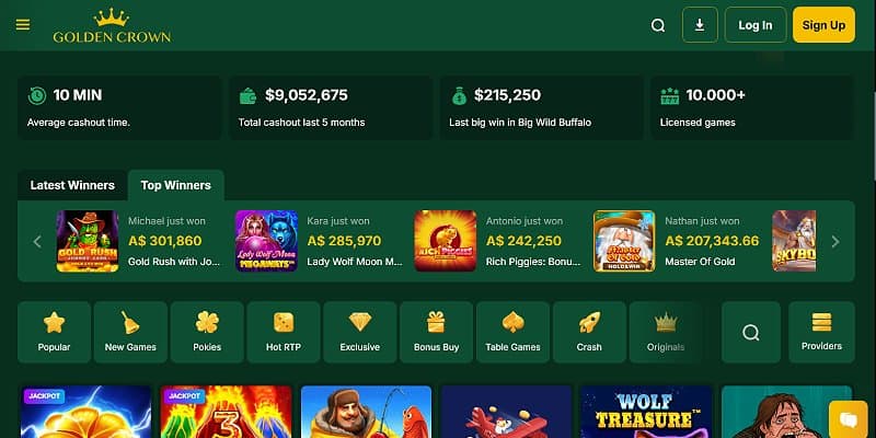 GoldenCrown is built for players who prefer larger bets and premium gaming environments. The site offers a massive welcome package worth up to A$15,000 plus 350 free spins, making it one of the biggest bonuses available in the Australian market.